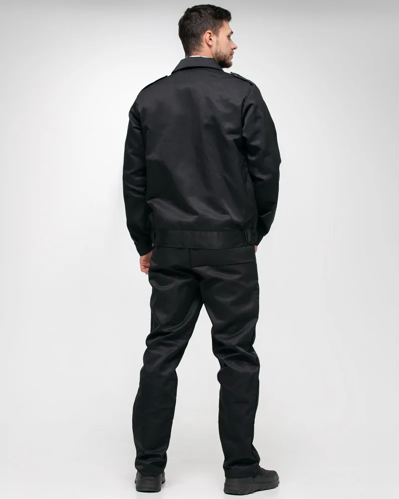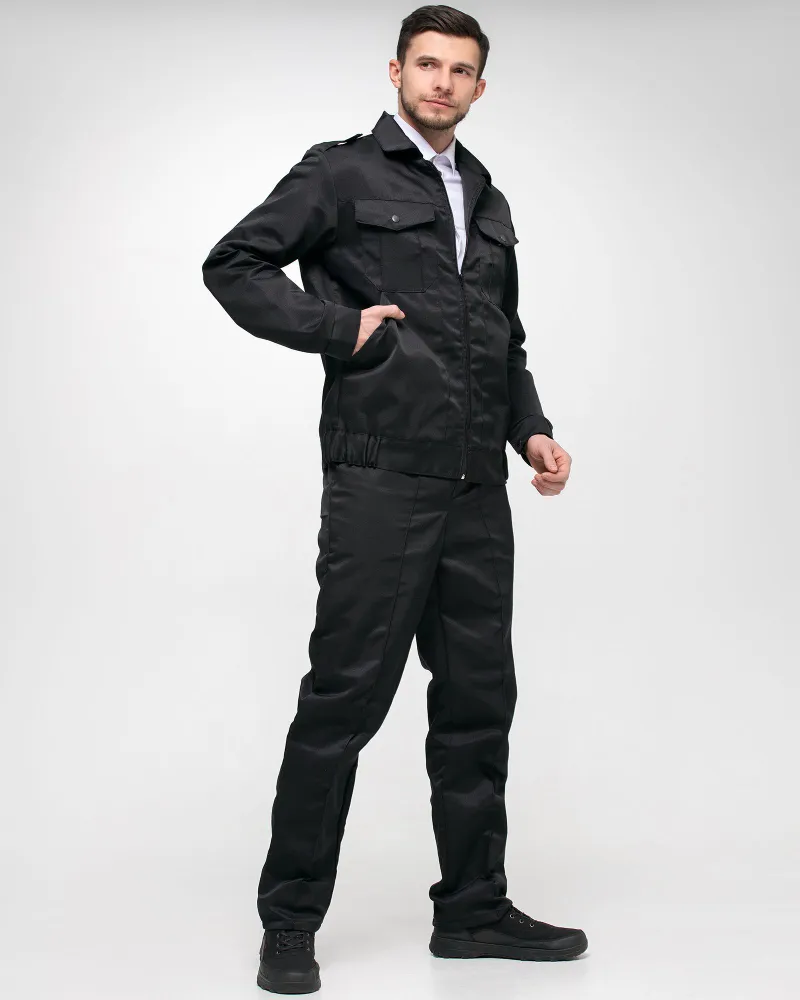 Костюм охранника, форма охранника состоит из куртки и брюк. Куртка укороченная с центральной застёжкой на молнию. С притачным поясом, по бокам стянут на эластичную тесьму. На полочке два нагрудных кармана и два нижних накладных кармана с косым входом. Рукава одношовные с манжетой. Вторник отложной. Брюки прямые с притачным поясом по бокам стянут эластичной тесьмой, застёжкой на молнию и пуговицу. Двумя внутренними карманами с наклонным входом и одним задним карманом с клапаном и застёжкой на кнопку. По длине передней половинки брюк прострочены стрелки. Ткань с ВО 240 гр цвет: черный.